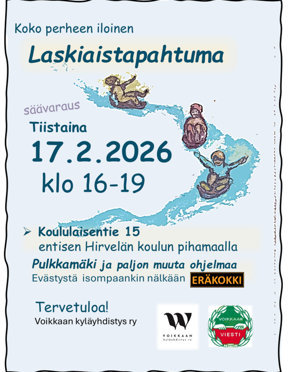 Tervetuloa koko perheen iloiseen laskiaistapahtumaan entisen Hirvelän koulun pihamaalle! (säävaraus) Luvassa tietysti mäenlaskua ja lisäksi nälän pitää loitolla Eräkokki! Pääset testaamaan, myös…