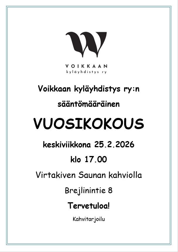Tervetuloa Voikkaan kyläyhdistyksen vuosikokoukseen ke 25.2.26 klo 17 Virtakiven saunalle. Osoite Brejlinintie 8. Kahvitarjoilu. Kaipaamme uusia jäseniä hallitukseen! Yt. Voikkaan kyläyhdistys